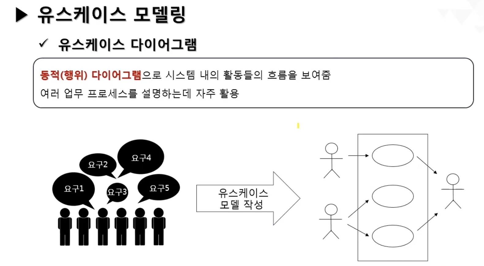 - 시스템이 해야 할 일(유스케이스use case)과 그 행동을 하는 사용자(Actor)을 함께 표현한 모델