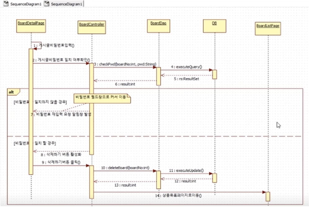 - 어떤 사이트에서 회원이 게시글을 삭제한다라는 동작을 구현할 때의 대략적인 시퀀스 다이어그램의 구조이다.