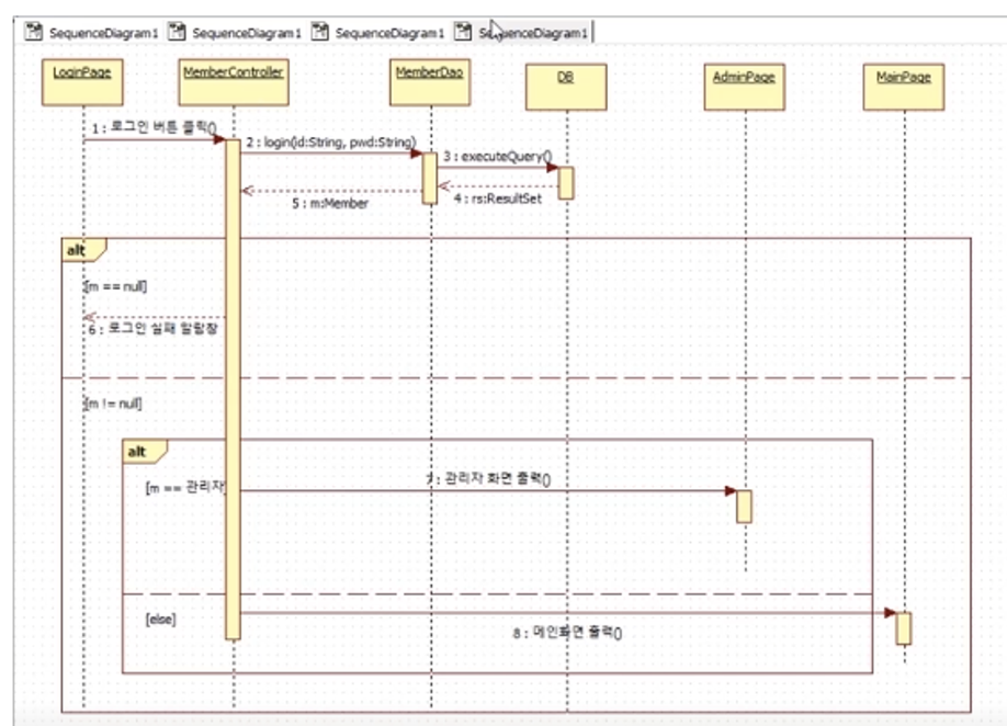 - alt(대체): 메시지의 대체 시퀸스를 포함하는 연산자로, 반드시 1개의 시퀸스만 발생한다. (if - else if 문에 해당하는 논리를 나타냄)