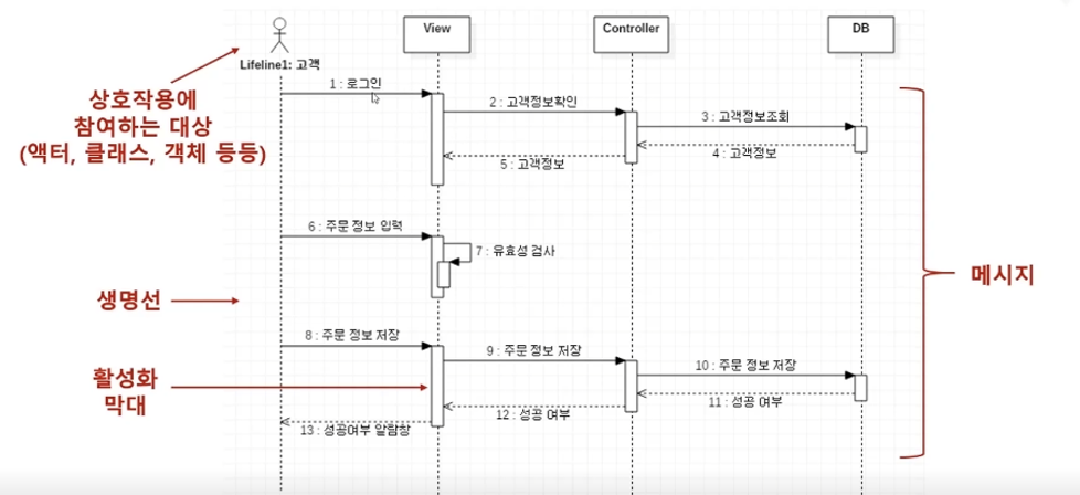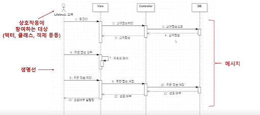 - 시퀀스 다이어그램을 표현할 때 생명선과 메세지를 사용하여 표현한다.