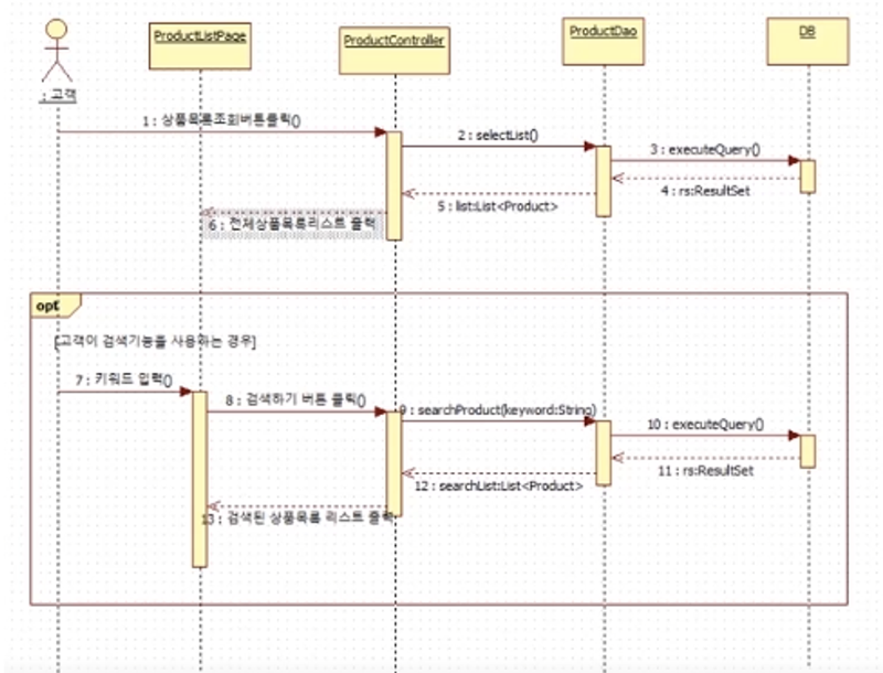 - 위 그림은 고객이 어느 사이트에서 상품목록을 조회하기 위한 동작을 할 때를 구현한 대략적인 시퀀스 다이어그램이다.