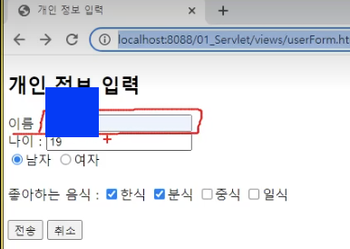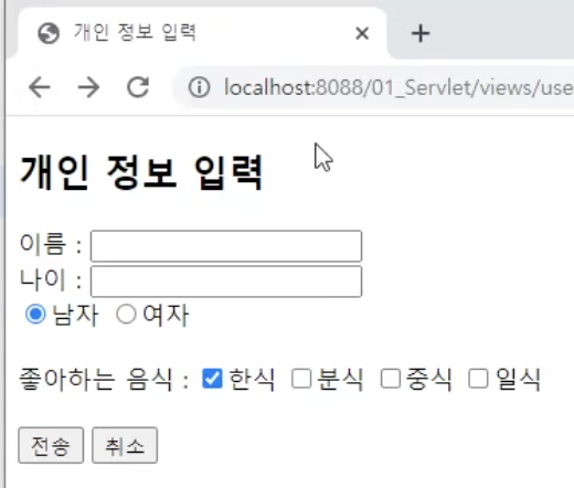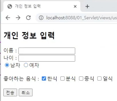 server구동시키고 브라우저 열고 새로고침 후 정보 넣고 전송버튼 클릭했을 때 사용자가 입력한 정보가 이클립스의 콘솔에 찍히는지 확인하기.