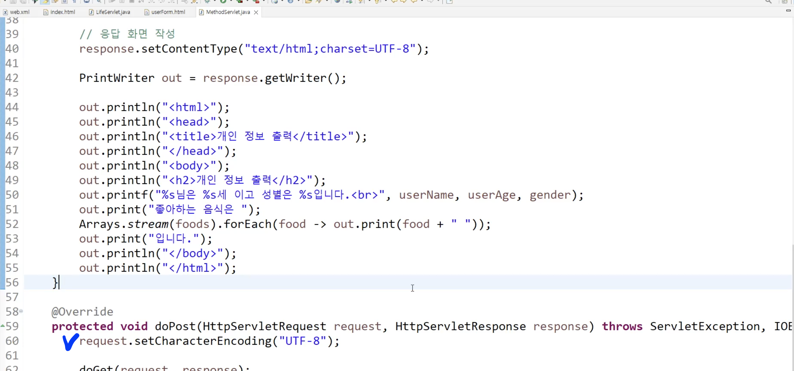 POST 방식으로 넘겨받는 데이터가 영어 또는 숫자가 아닌 경우에는 request.setCharacterEncoding("UTF-8");를 추가해서 파라미터 값을 가져오기 전에 인코딩을 설정해야 한다.