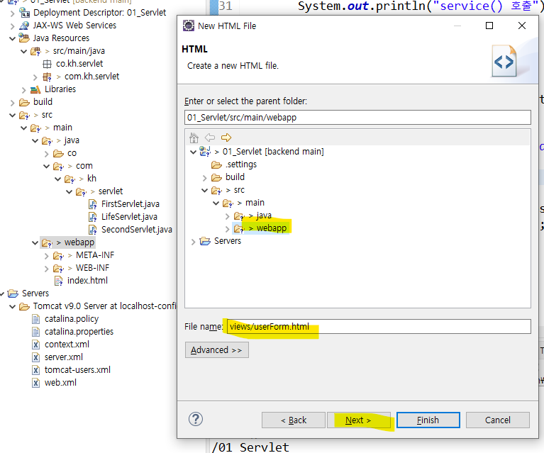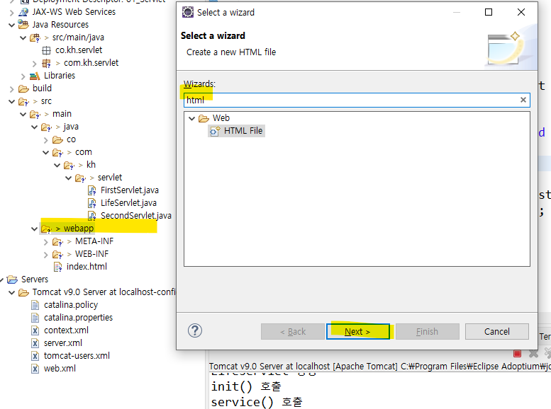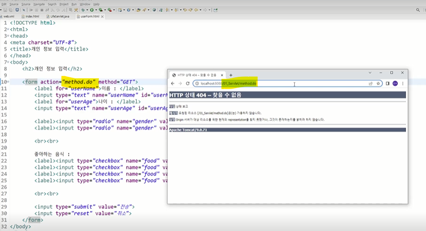 지금 상태에서는 404오류가 발생한다. 요청을 처리해줄 servlet을 생성하지 않았기 때문!~
