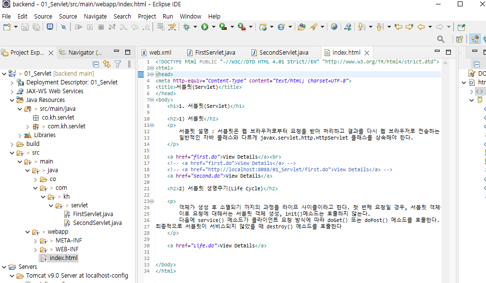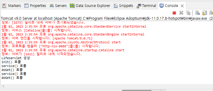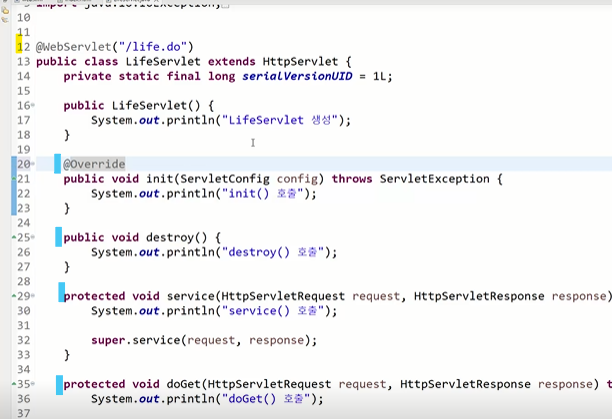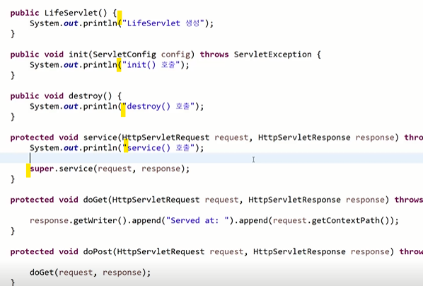 + (참고사항) 서버가 종료되거나 서블릿이 수정이 돼서 다시 컴파일 해야 하는 경우에만 서블릿이 소멸되는데 그때 destroy 메서드가 호출된다.