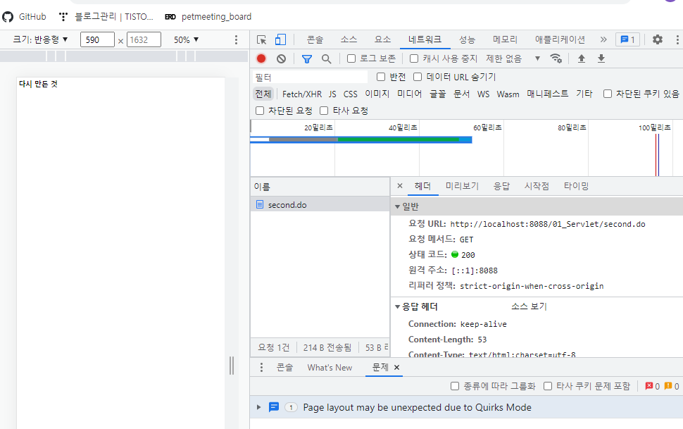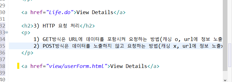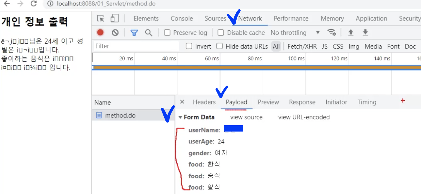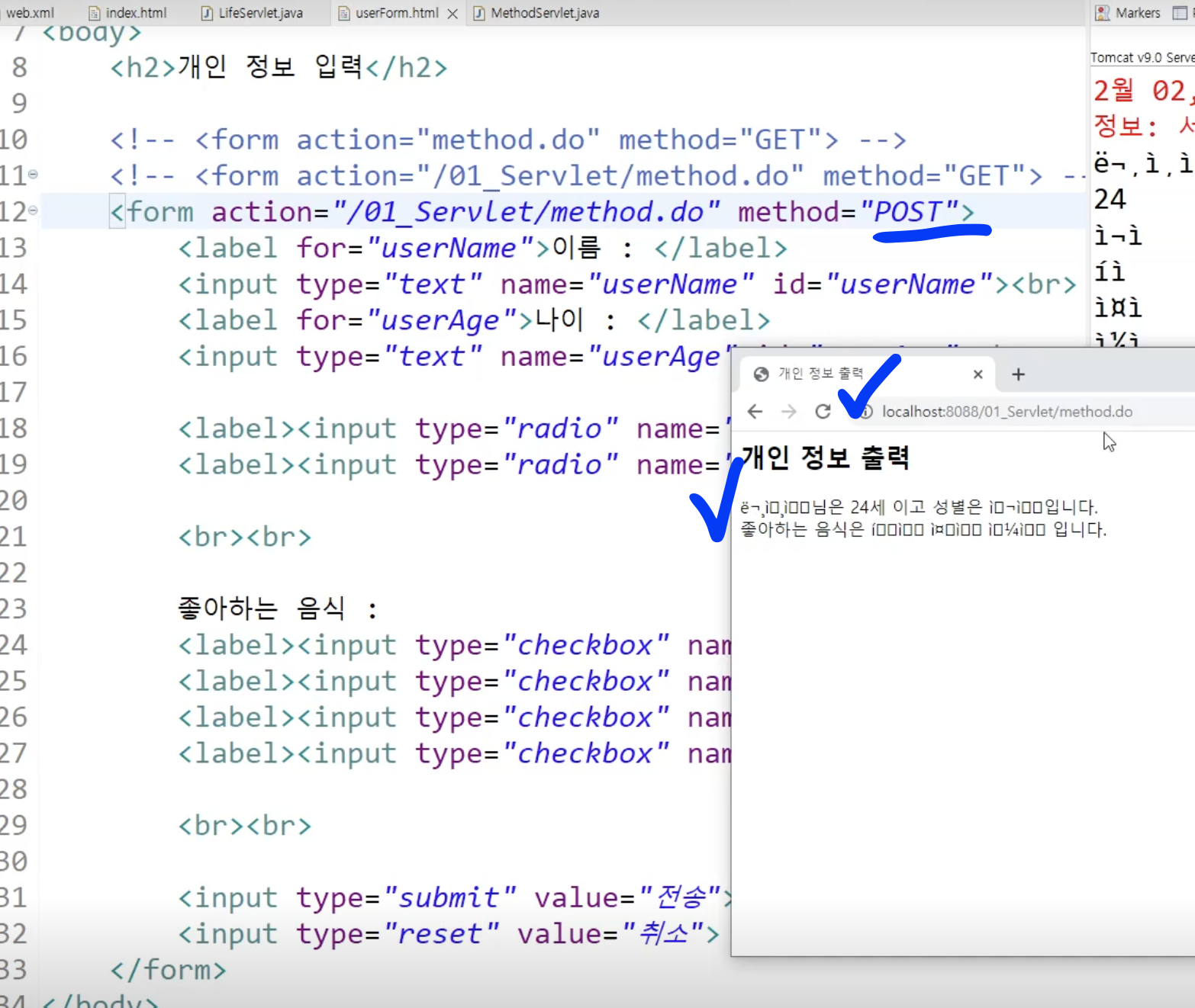 GET 방식 ->POST 방식으로 변경시 출력되는 한글이 깨지고 데이터가 url에 포함되지 않는 것을 확인해보면 된다.