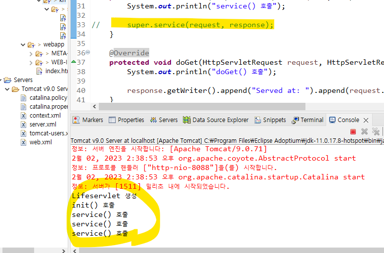 super.service(request, response); 를 주석처리하면 doGet이나 doPost는 호출되지 않고 하얀 화면이 뜬다.