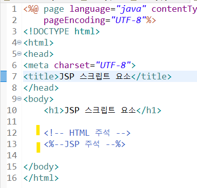 - JSP 스크립팅 요소들은 <%로 시작해서 %>로 끝나는 것이 특징이다.태그표기법
