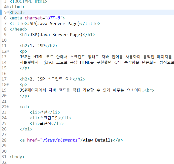 - JSP는 동적인 페이지를 만들기 위해 다양한 스크립팅 요소(태그)를 제공한다.